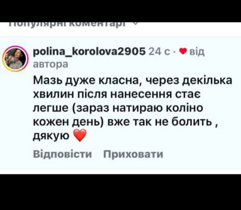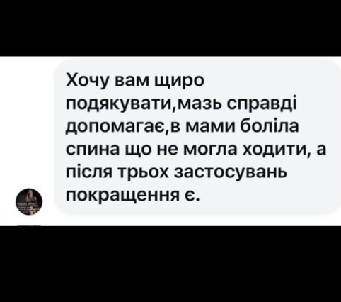 - Тип:: Натуральна мазь; *не містить хімічних та шкідливих компонентів *абсолютно безпечна *на 100% ефективна