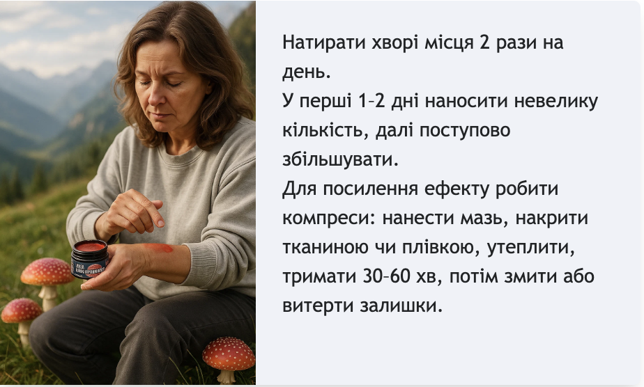 Сьогодні ми відновили стародавній рецепт і перетворили його на мазь з червоного мухомора, створену в серці Карпат. Повністю натуральна, без жодної хімії, вона наповнена енергією гір та силою природи — відновлює легкість рухів, знімає втому та напруження